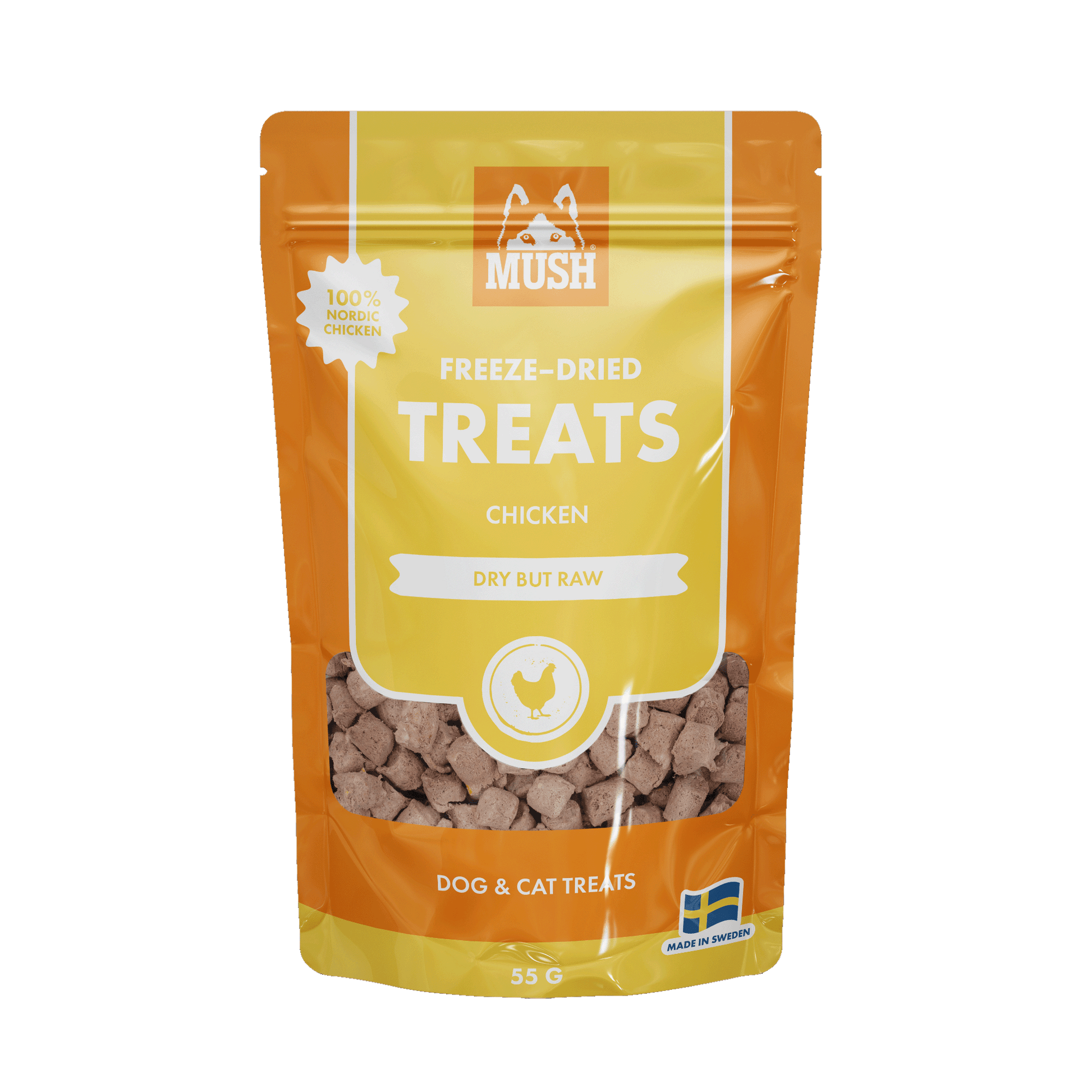 MUSH's freeze-dried treats range includes eight new products, consisting of ingredients from pork, beef, chicken and lamb. The products are made from high-quality Nordic ingredients, completely free of additives, in their own factory in Nässjö, Sweden. The range is a natural and high-quality choice for dogs and cats.