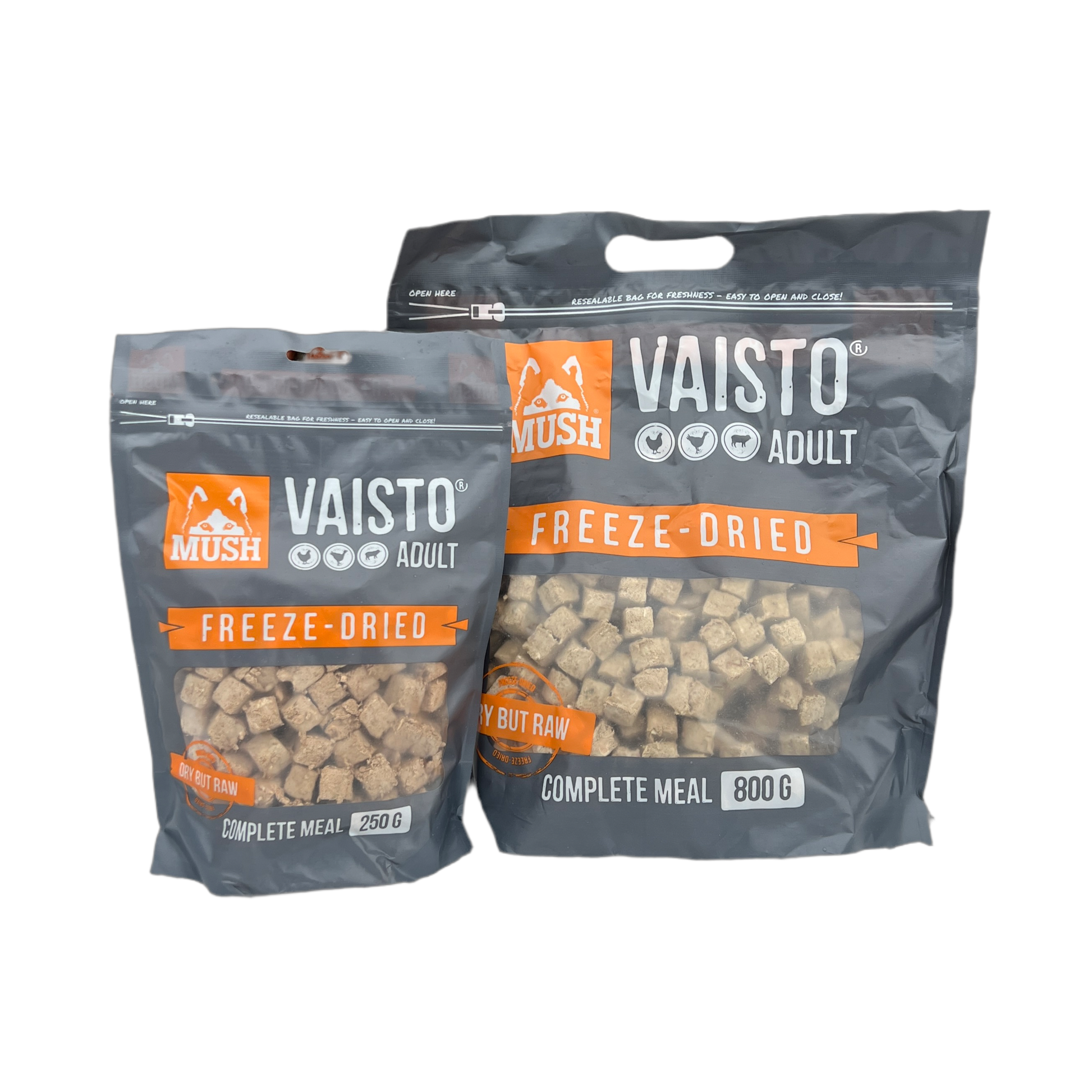 This is the freeze-dried version of Vaisto Grey with chicken, turkey and lamb. It is a complete complete food that is suitable for all adult dogs, especially those that are more active. Thanks to the higher energy content, Vaisto Grey is a good choice to take with you on e.g. mountain hikes or hunting trips.