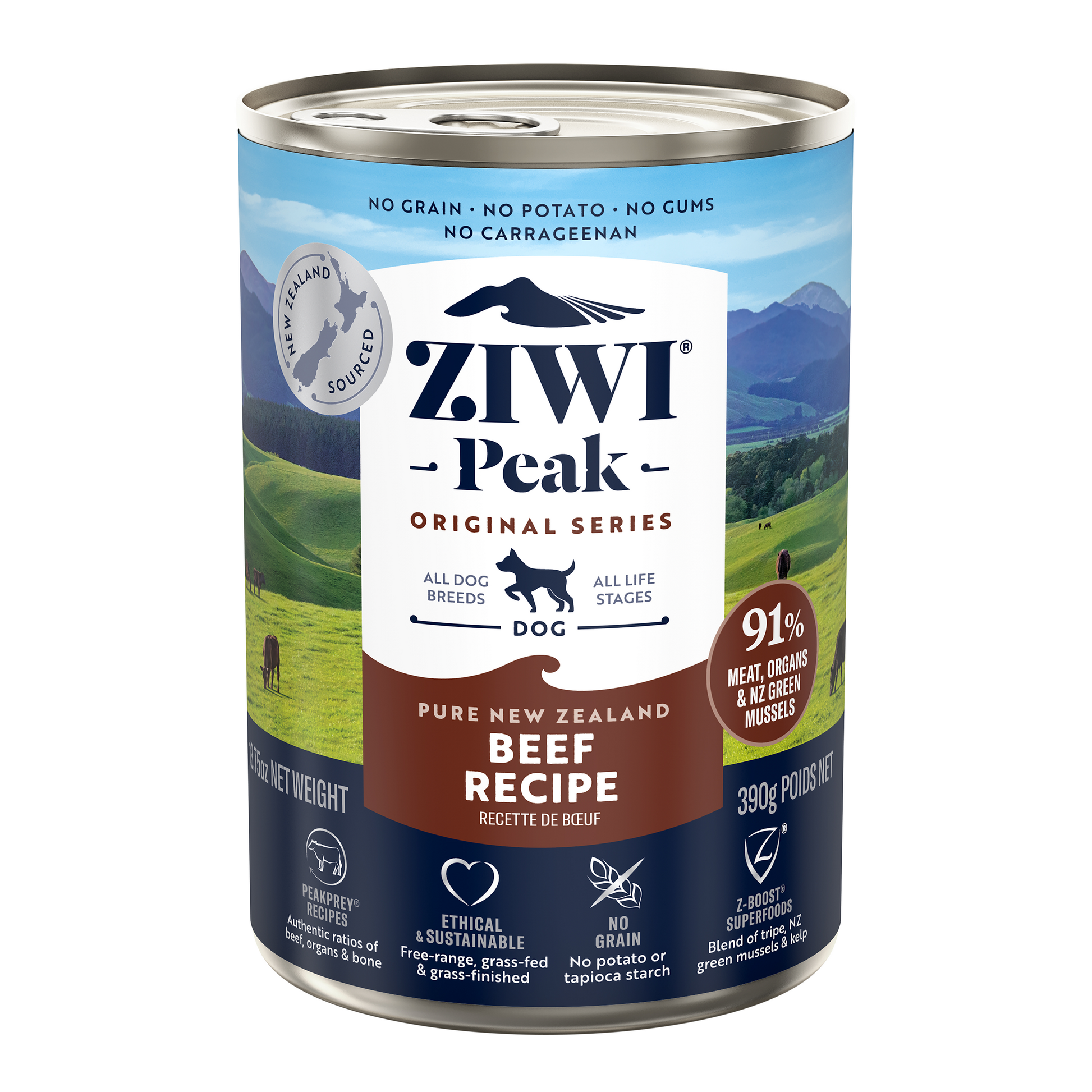 ZIWI Peak wet dog food contains 91% meat, organs, seafood and bones, all ethically sourced from New Zealand. It is made with 100% free-range, grass-fed and cage-free meat and wild-caught seafood - all from New Zealand farms and pristine oceans. The meat in this recipe comes from cattle that have access to lush pastures year-round, and are of course free of hormones, antibiotics or growth promoters.