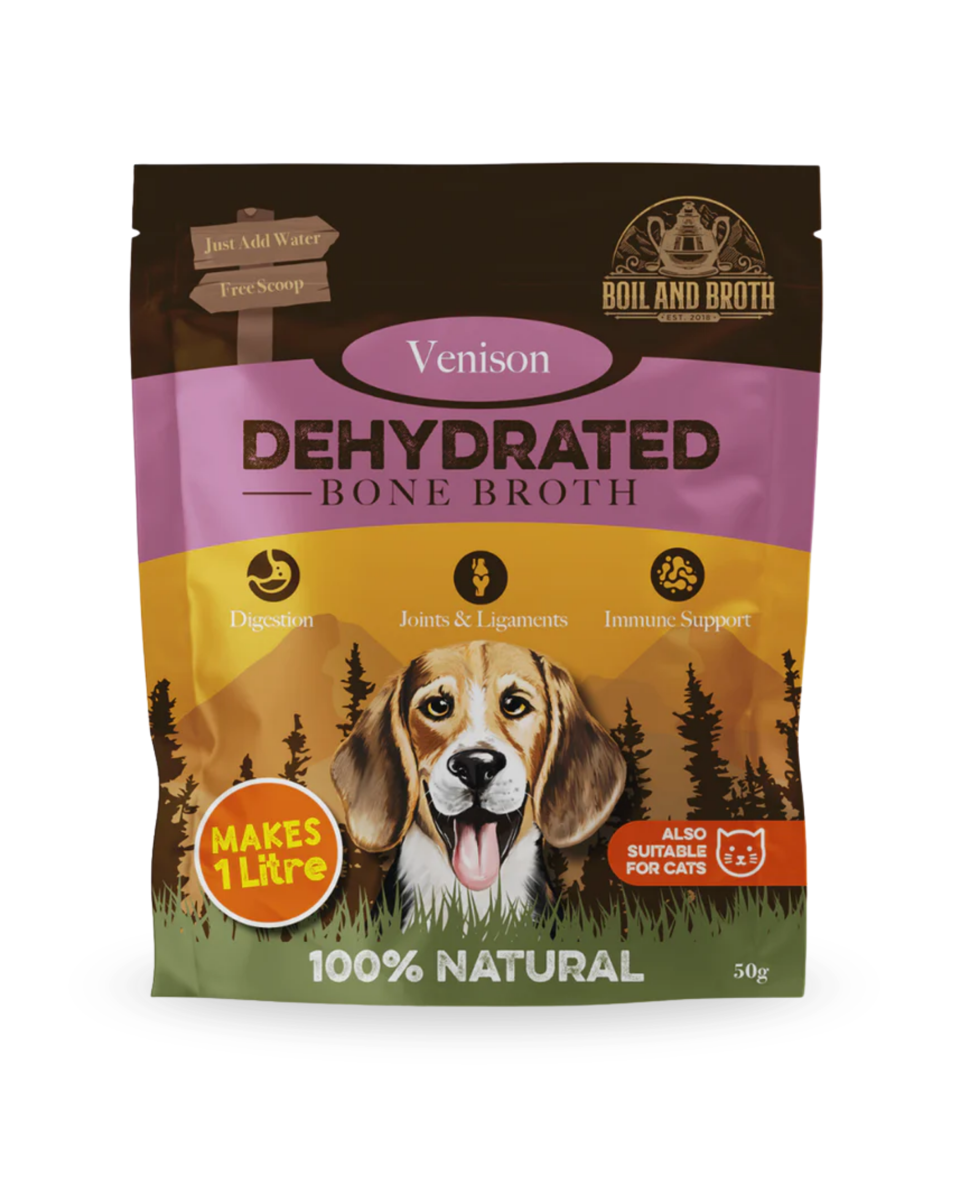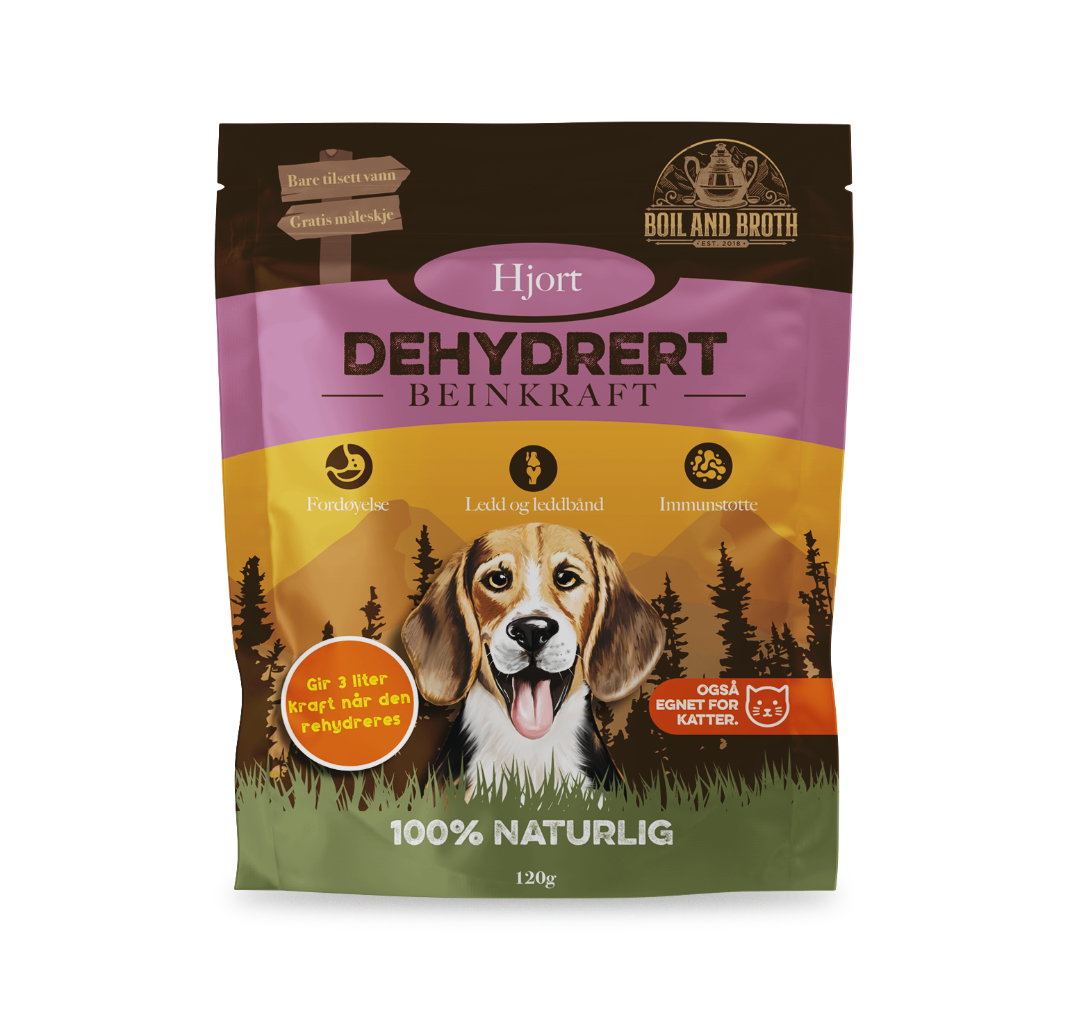 50g pulver blir om til ca. 1 liter beinkraft. Dette produktet er dehydrert, og selvsagt 100% naturlig. Disse er perfekt å ta med på reise eller tur, da de tar liten plass i bagen og du trenger kun å koke vann for så å blande pulveret ut i det! Egnet for hunder og katter uansett hva de fôres med, og uansett livsstadium.