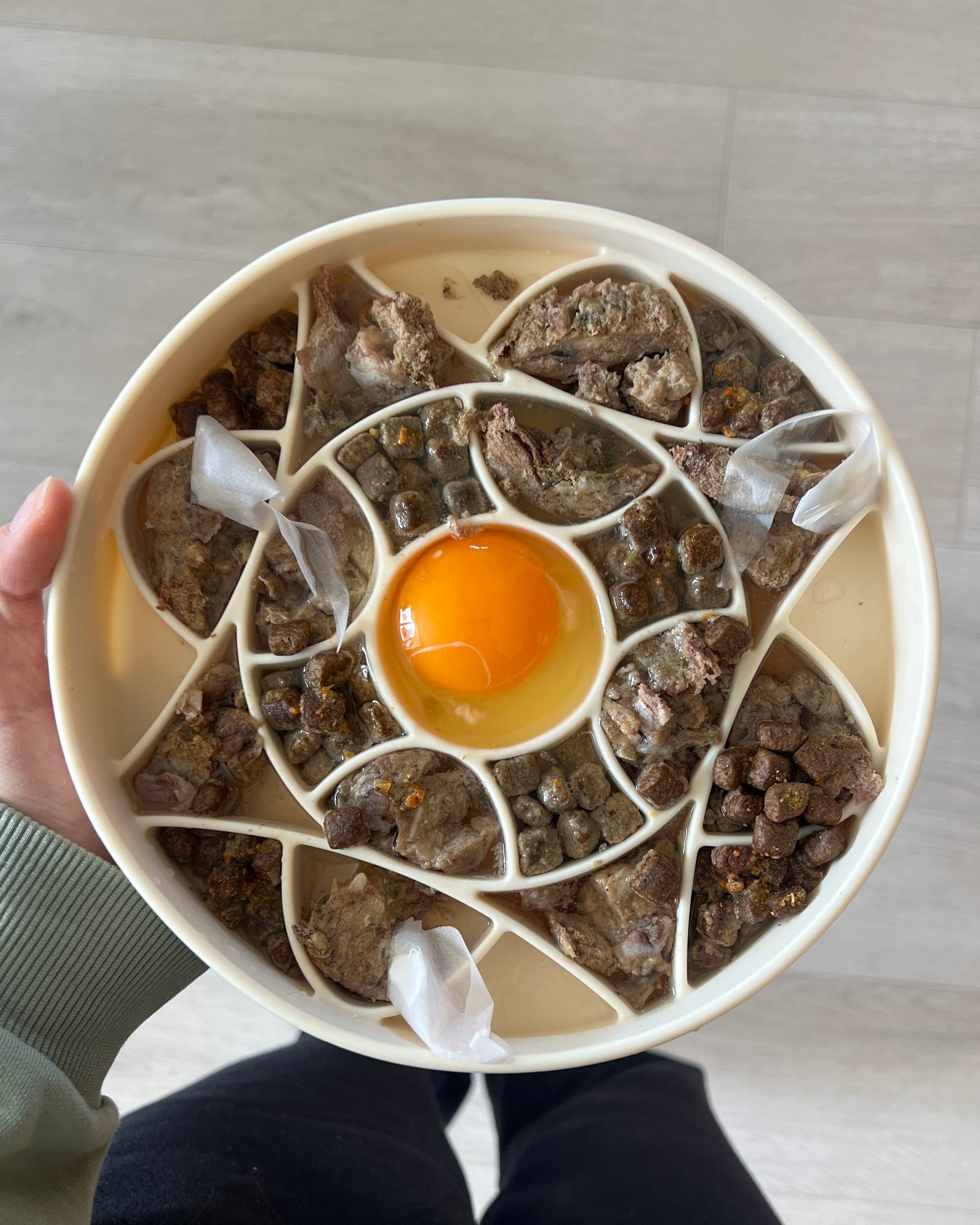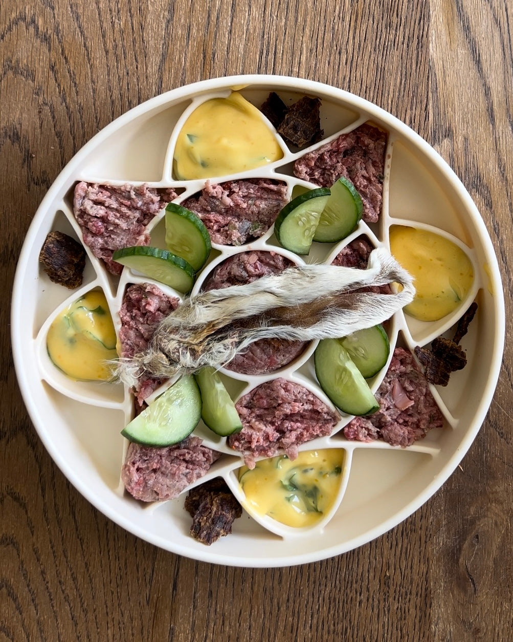 Sklir ikke på gulvet og hundene koser seg lenge med maten. I vanlig matskål er maten inhalert på tre sekunder. Og med masse små "rom", så er det så koselig å lage i stand smakfulle måltider med masse godt og variert.