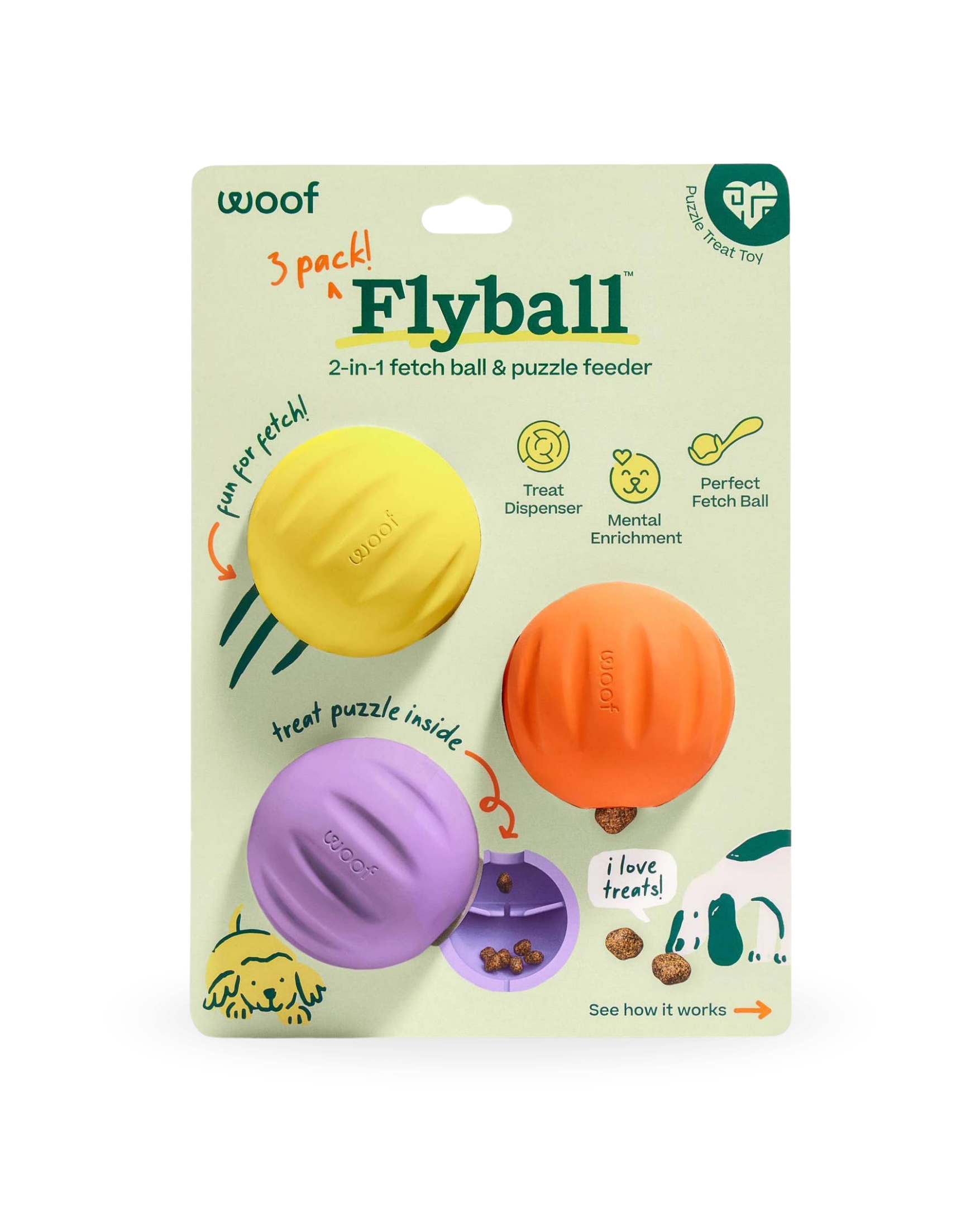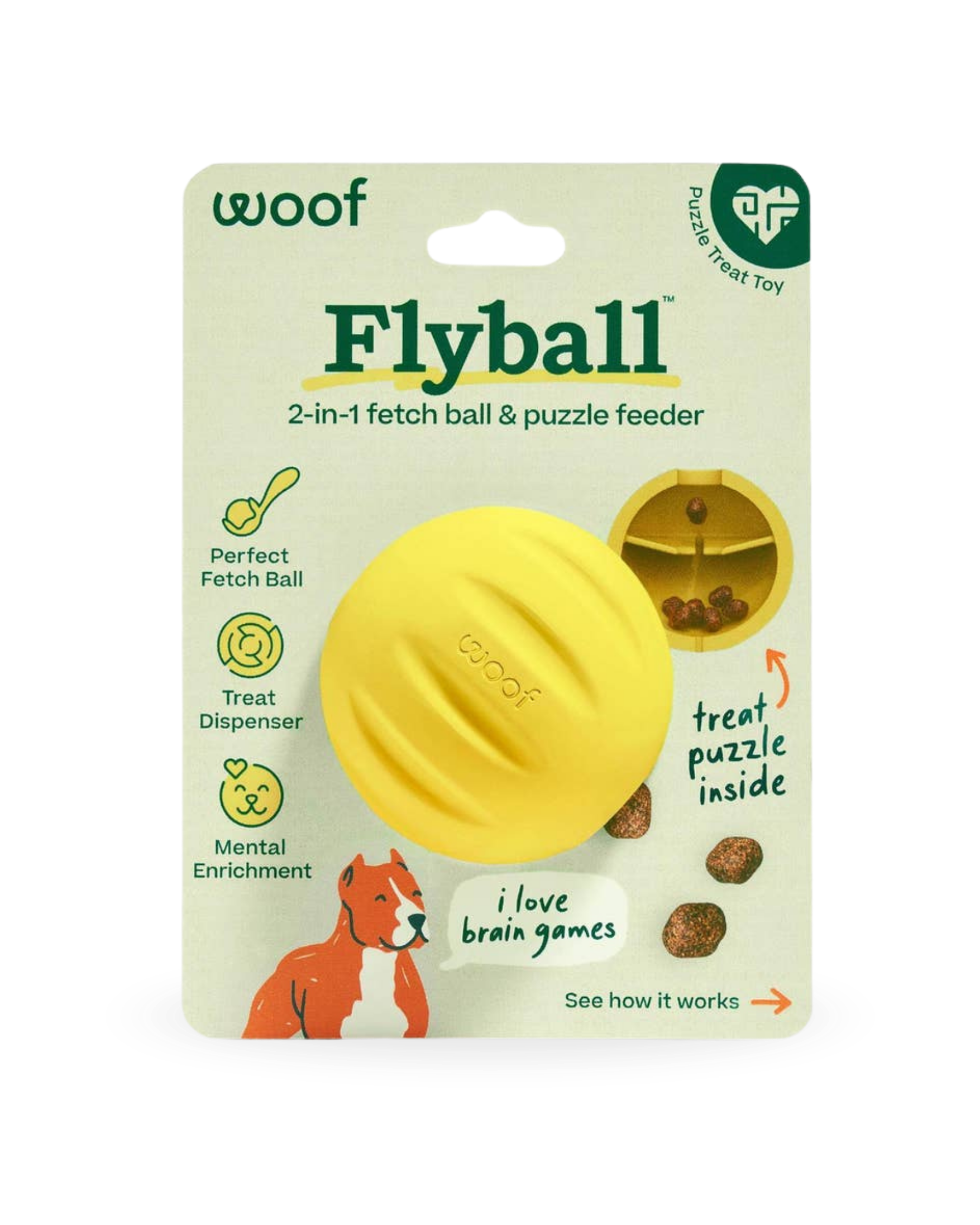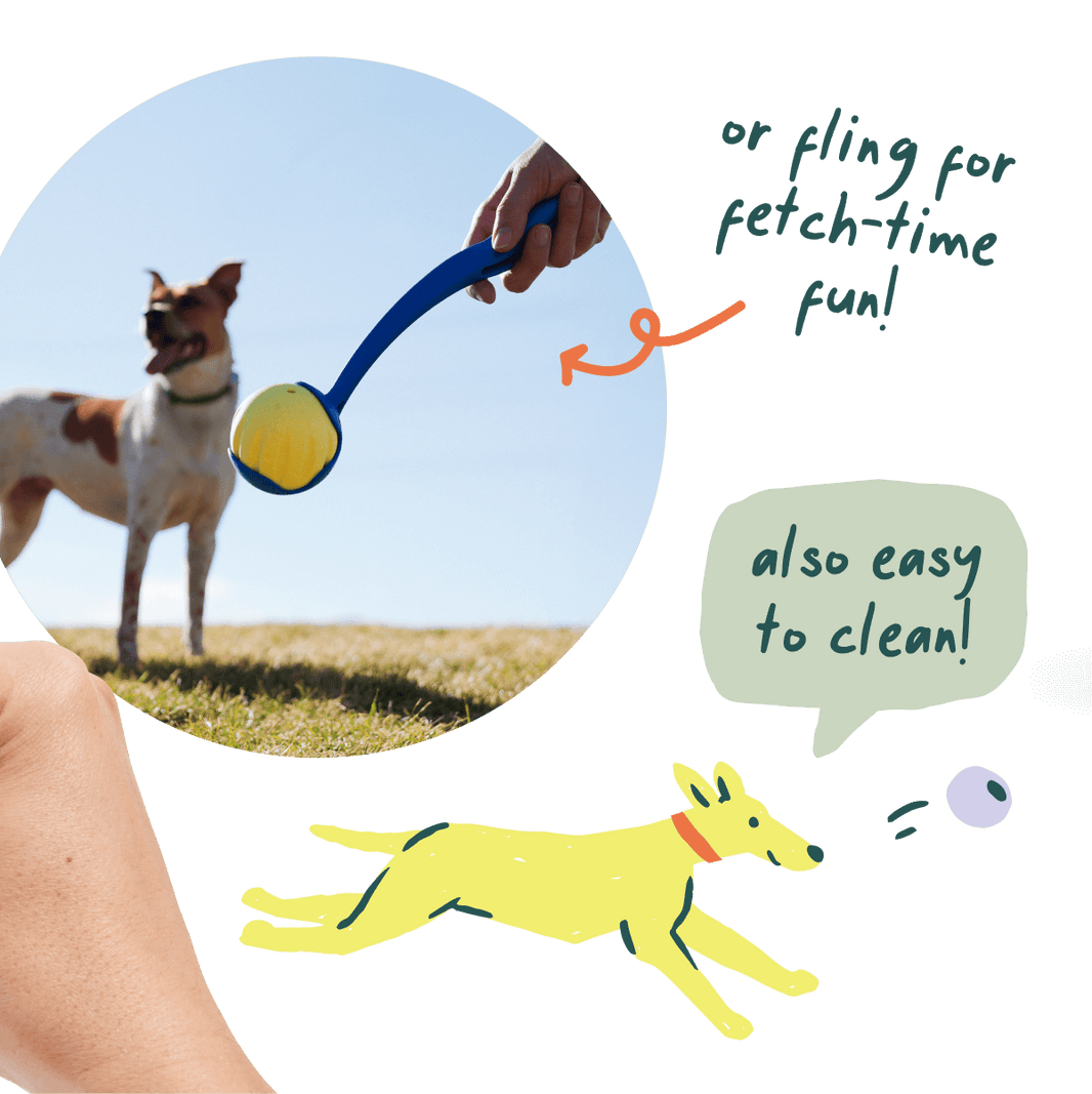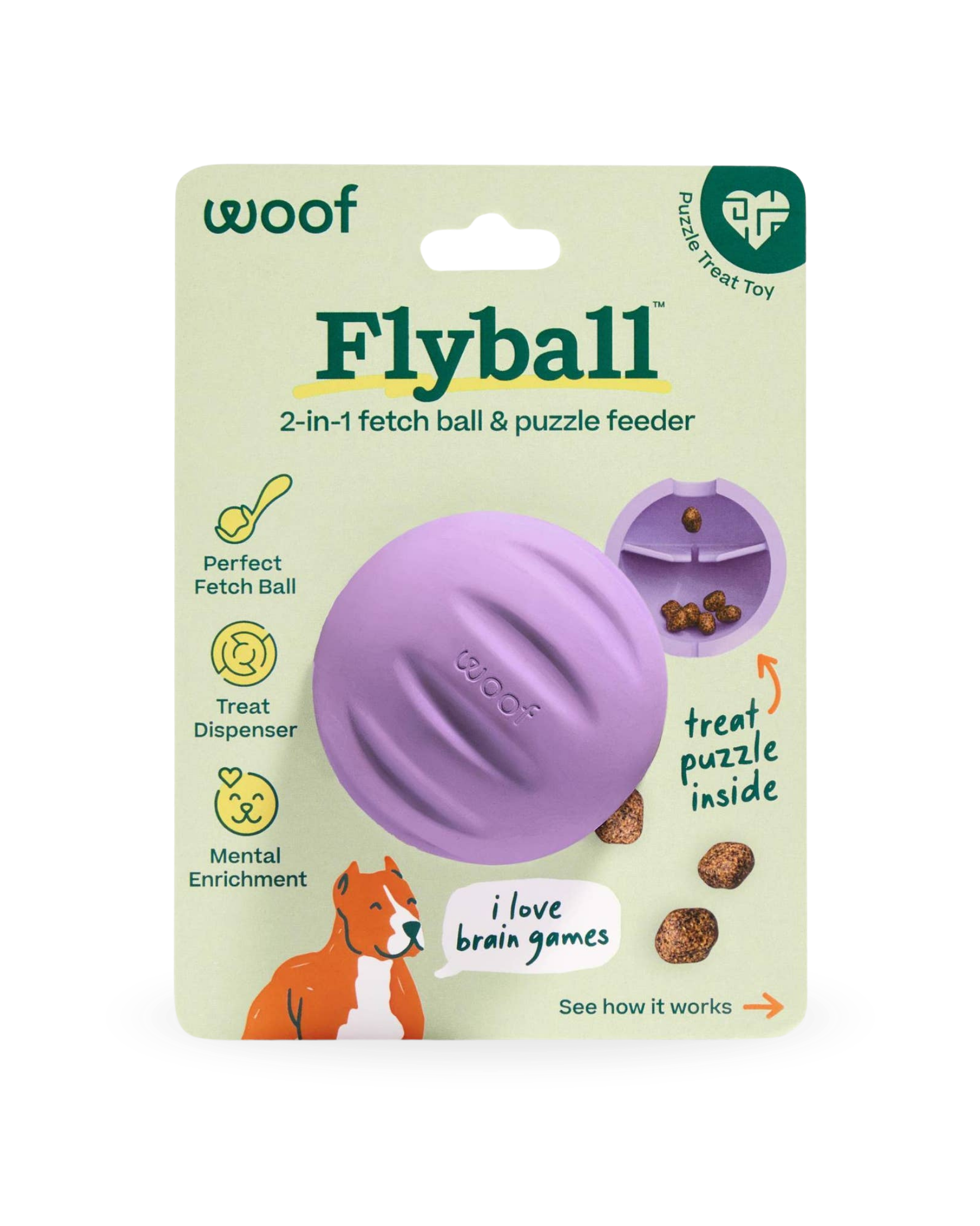 Apportering er gøy, men Flyball gjør det enda bedre! Utendørs er det en slitesterk ball som passer til kastere, og er laget for endeløs apportlek. Innendørs gjør de skjulte kamre for godbiter Flyball om til en uimotståelig aktivitetsleke. Fyll den med passende godbiter og la hunden jobbe for å få de ut. Én leke, to måter å leke på.