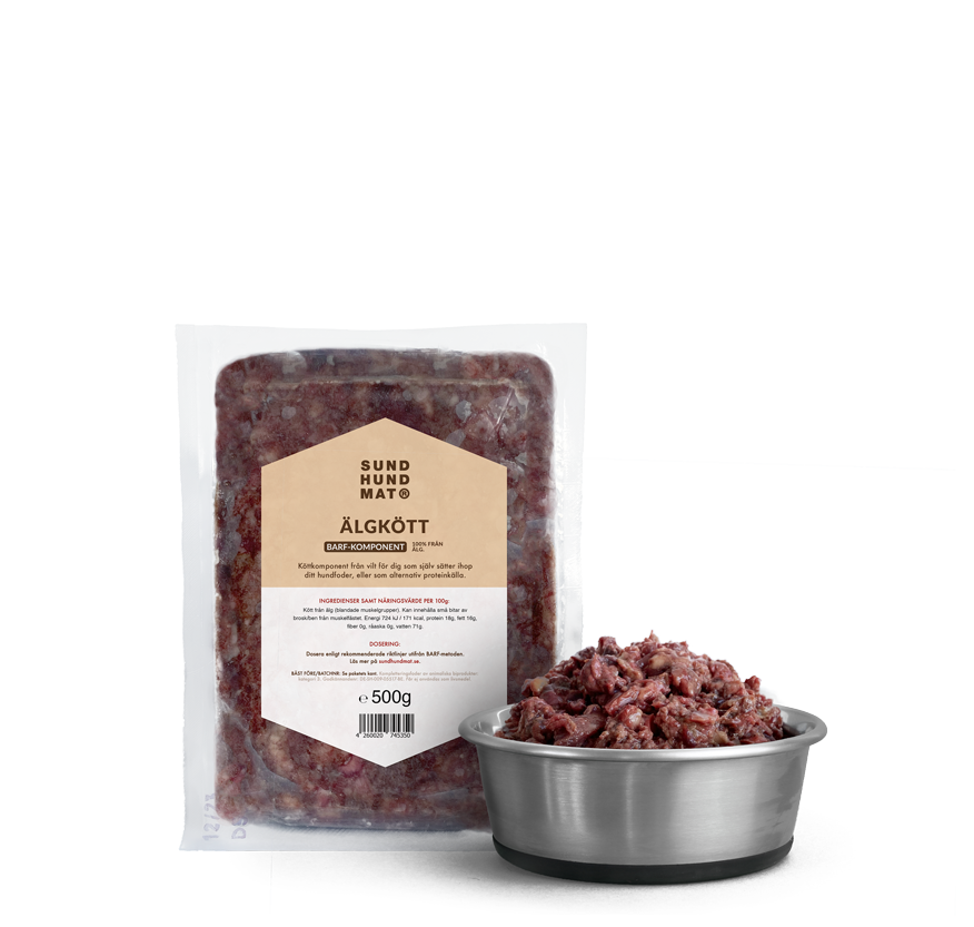 100% elgkjøtt (blanding av forskjellige muskelgrupper fra elg). Kan inneholde små biter av brusk/bein fra muskelfestet.