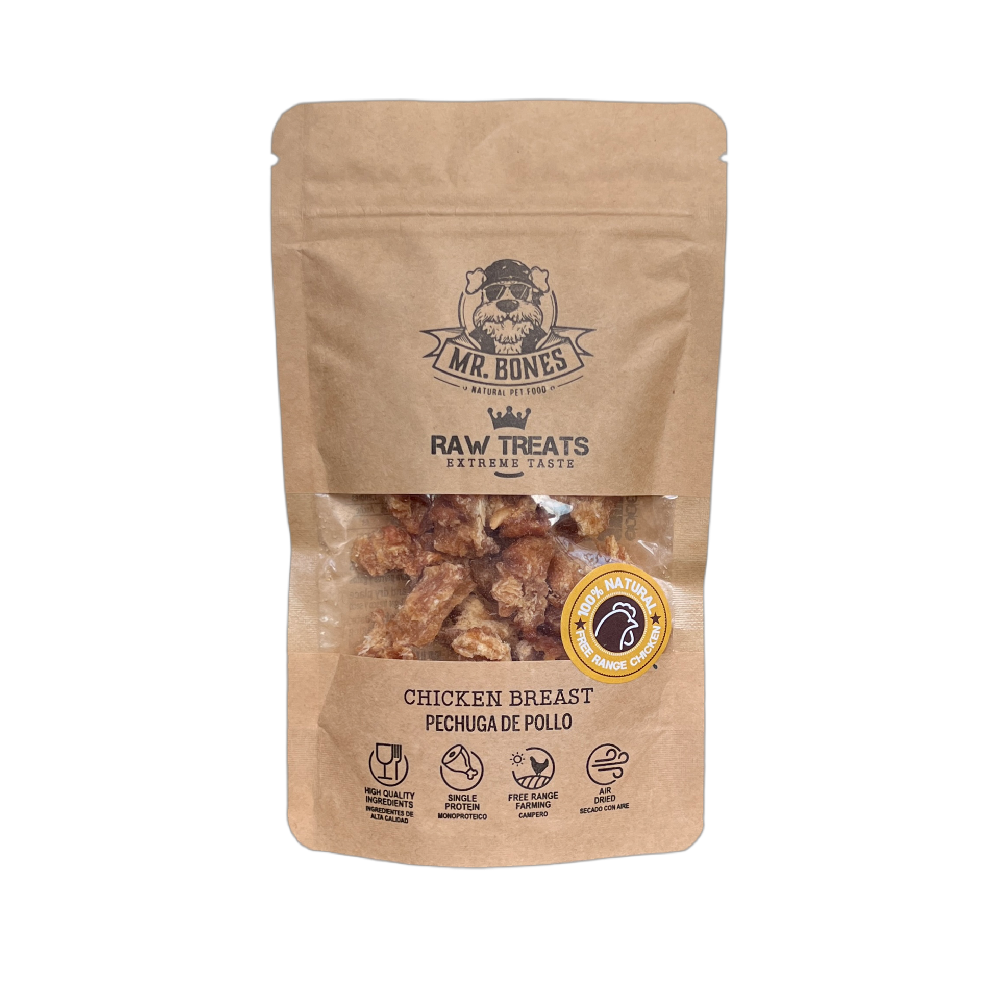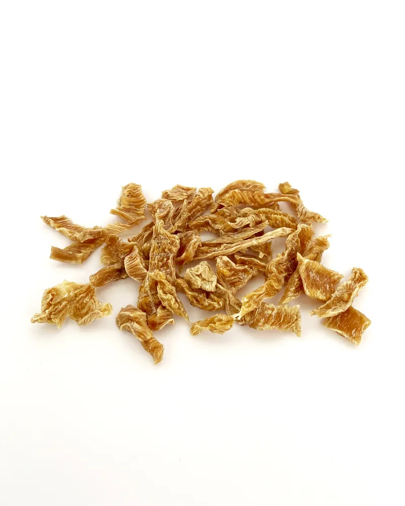 Godbitene er laget av kyllingbryst fra kyllinger som har gått fritt hele sitt liv. Dette er et 100% naturlig produkt som kun består av kylling, og kvaliteten på kjøttet kan ikke sammenlignes med det som ofte brukes i fôr. En ordentlig smakfull godbit som passer ypperlig til både hund og katt!
