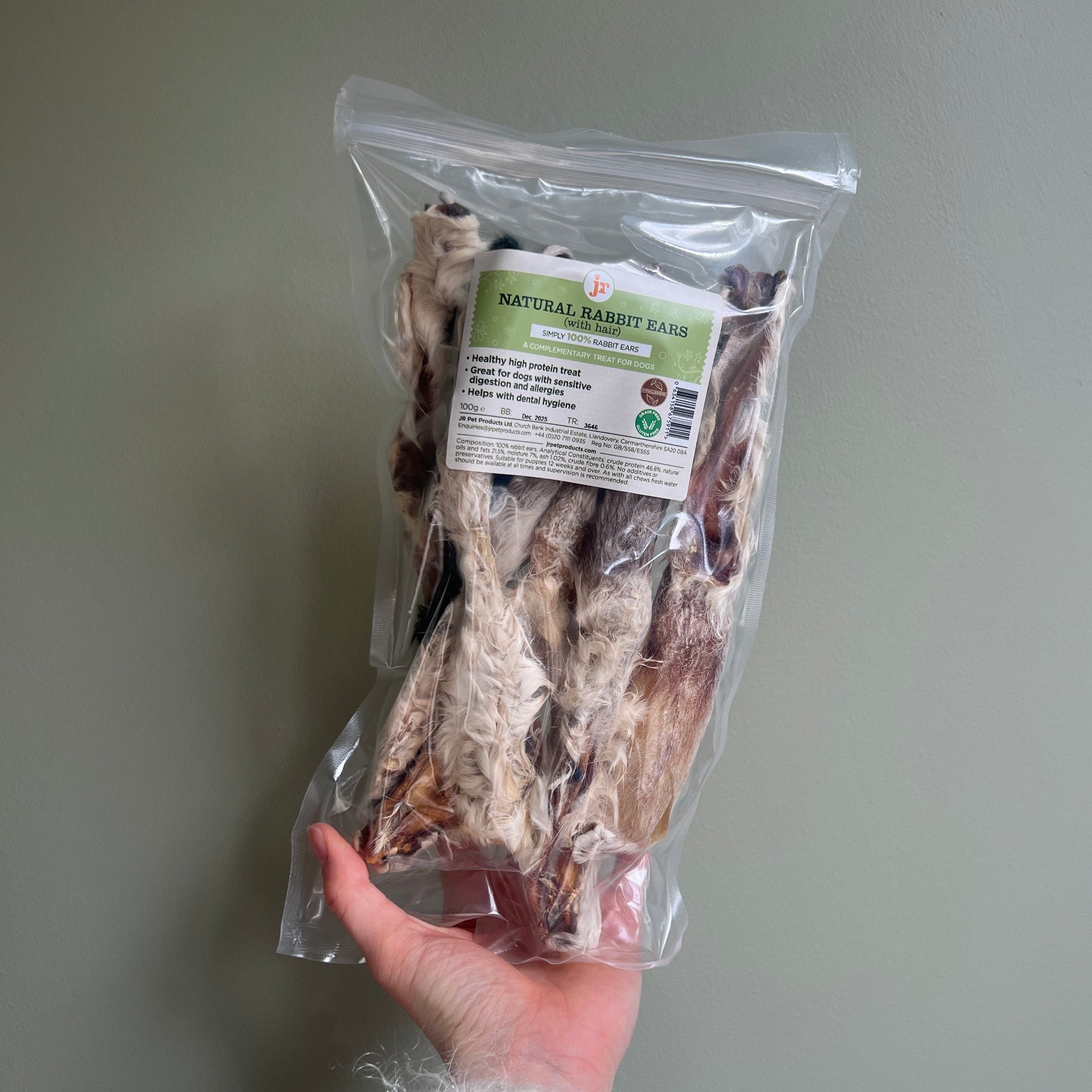 Kanin er flott alternativ for hunder som har allergi eller overfølsomhet overfor f.eks. storfe eller gris. Disse ørene er lettere og mer delikate enn lammeørene fra samme merke, og er dermed perfekte når du skal introdusere hunden for tygg med pels. Tyggene har et høyt innhold av kollagen, som er bra for ledd og muskler, men også for hjertet. De inneholder i tillegg glukosamin og kondroitin, som også bra for leddene!
