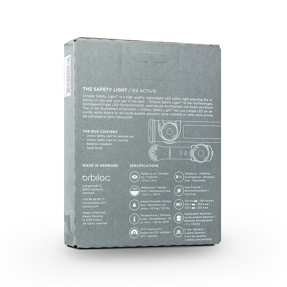K9 Active inneholder et sikkerhetslys i fargen amber og en lys i fargen dark (andre farger finner du HER). I tillegg får du med et armbånd og en klips, som du enkelt fester rundt armen, samt en stropp til å feste på dyrets sele eller halsbånd. Ved å kjøpe dette praktiske kitet, sørger du for at både du og kjæledyret ditt er så synlig som mulig mens dere er utendørs.
