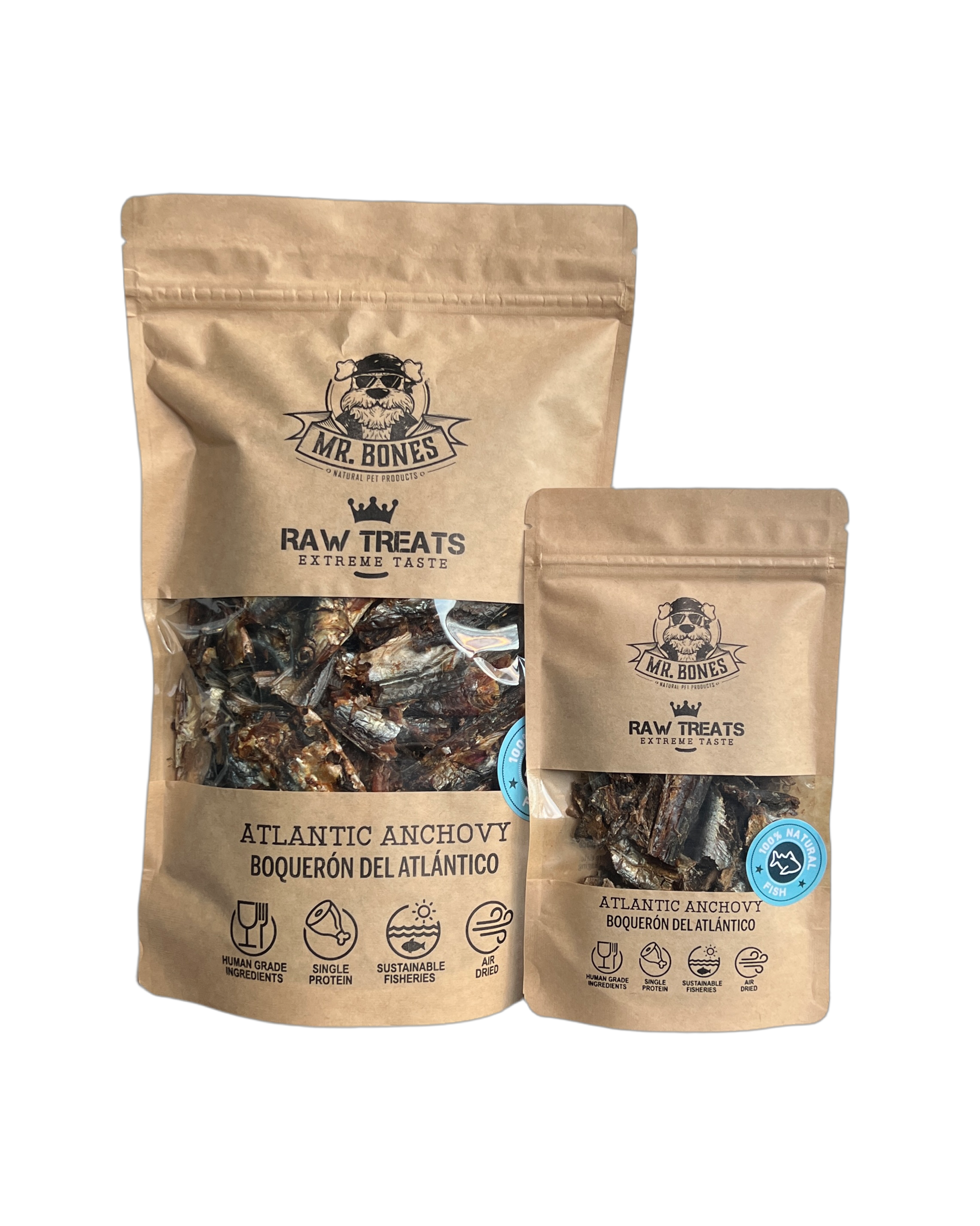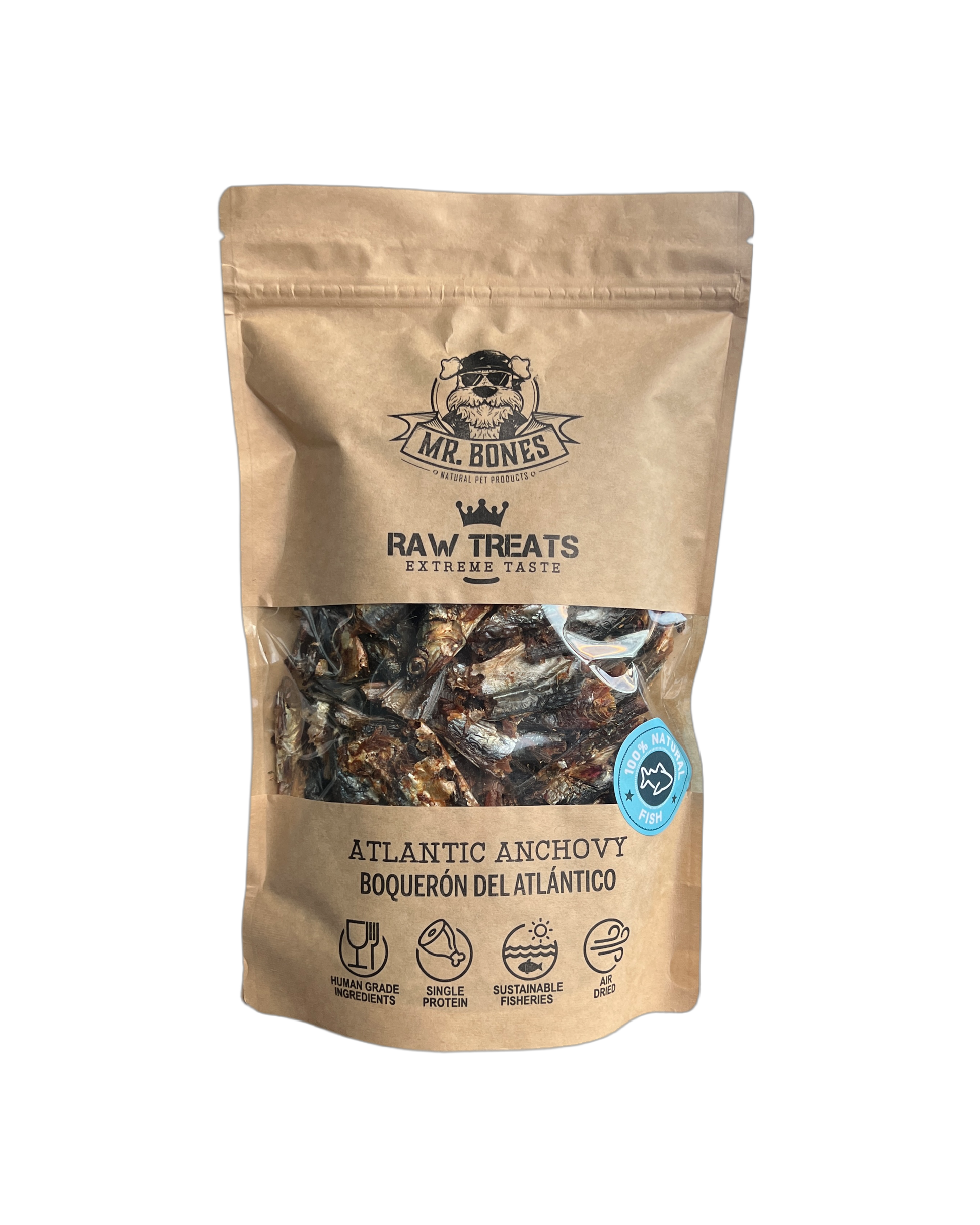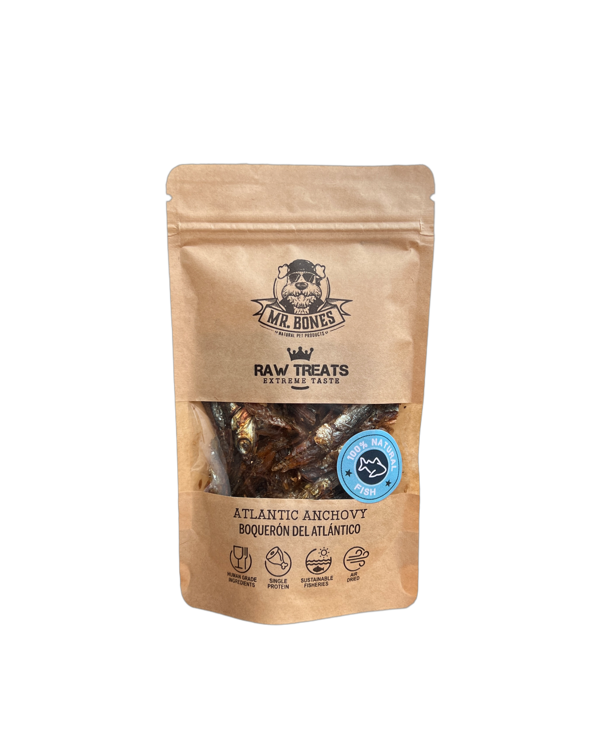 Disse lufttørkede ansjosene kommer fra Atlanterhavet og er 100% naturlig. Ideell som godbit, men kan også brukes i f.eks. nosework eller som topper på et måltid både for hund og katt. Ansjosen er av menneskelig kvalitet. De er kuttet i små biter og lufttørket ved lav temperatur hvor fuktigheten gradvis blir eliminert og levetiden forlenget. Det vil si at alle næringsstoffer, aromaer og smaker blir bevart!