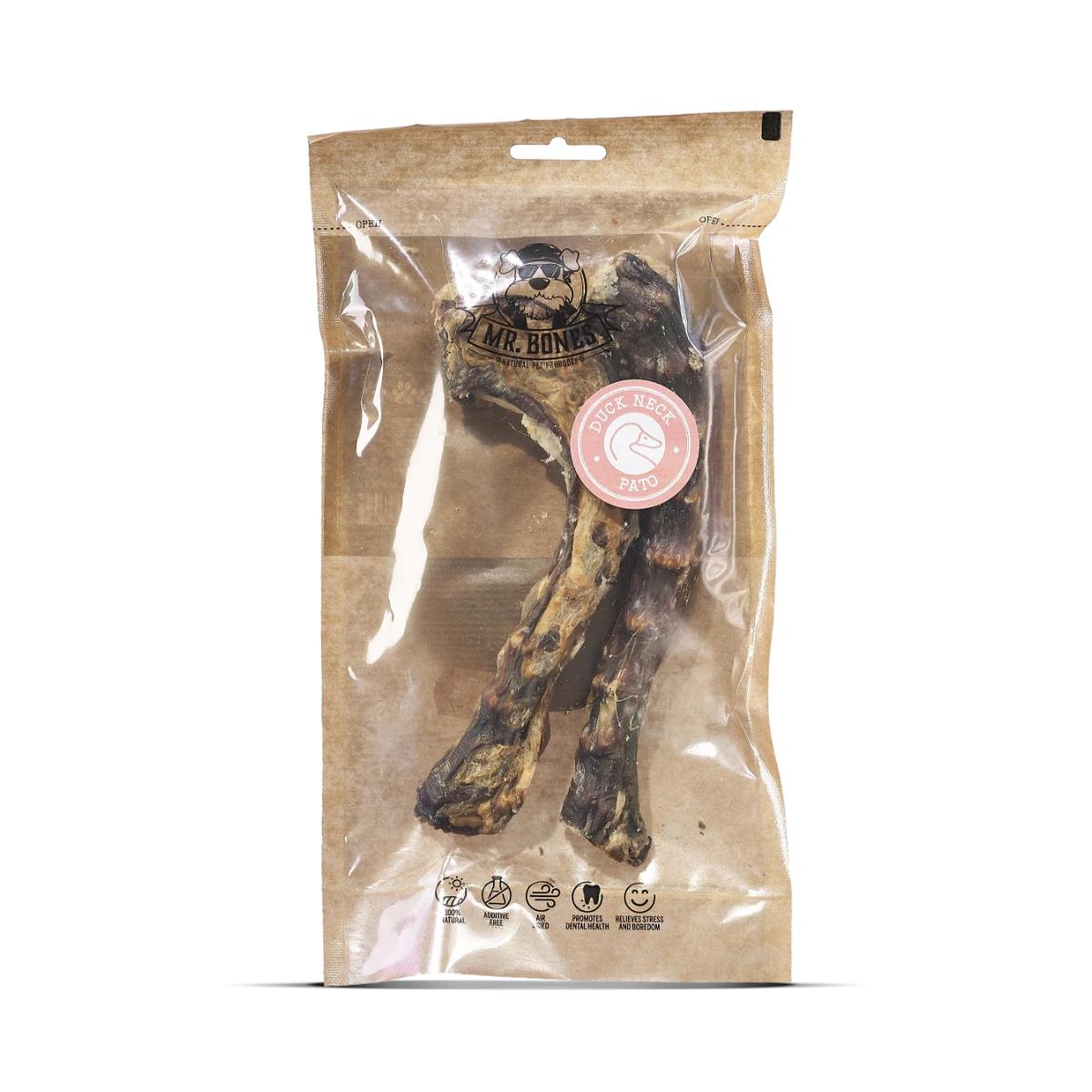 Andehals anses som "myke bein", så det er ingen fare for at det vil splintre. De er også et godt alternative for hunder med matallergi eller intoleranse for de typiske vanlige proteinene som storfe, kylling etc. Tygg er med på å holde hundens tenner sunne, sterke og rene. Hals er en perfekt snack for hunder ettersom den gir dem en trygg og sunn måte å tilfredsstille deres naturlige instinkt til å tygge på ting.