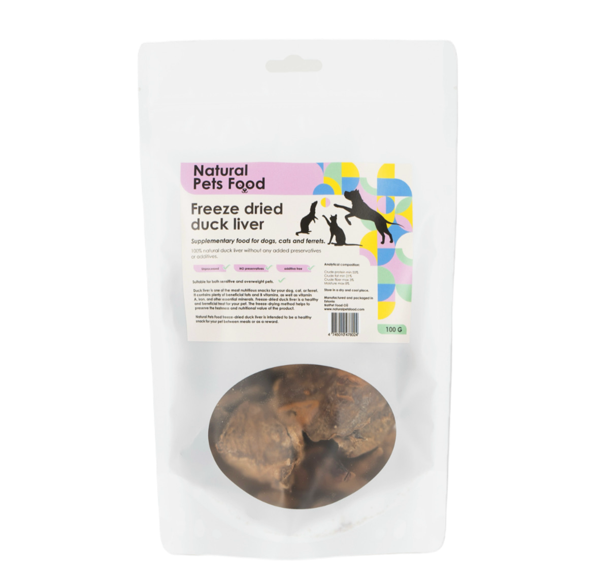 100% naturlig andelever som er frysetørket. Helt uten tilsetningsstoffer og konserveringsmidler.