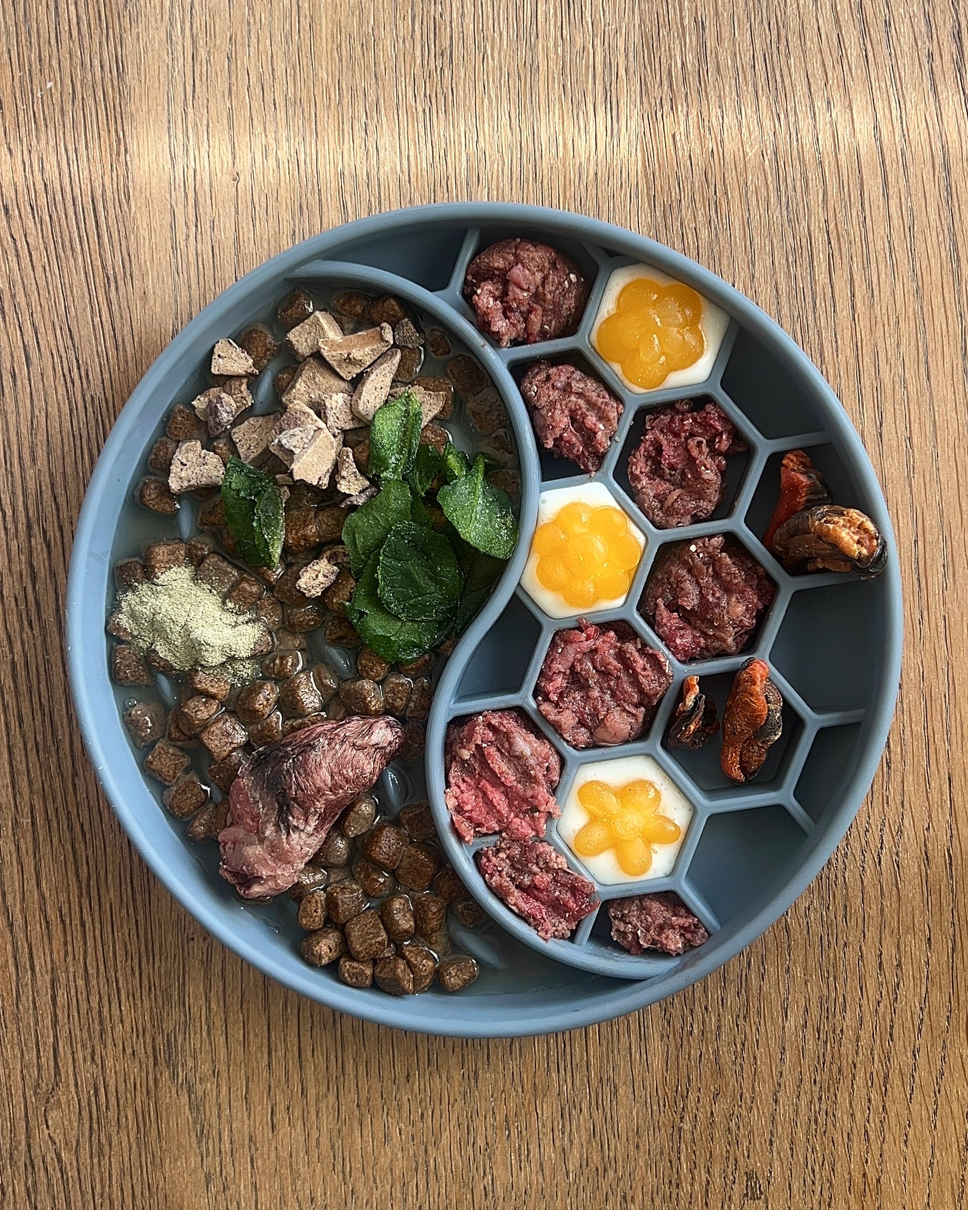 Dette er første slowfeeder vi tester og Yoshi brukte endelig litt lenger tid på å sluke ned maten og rensa den godt for alle små rester 😂