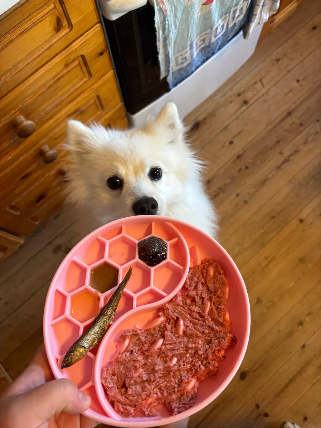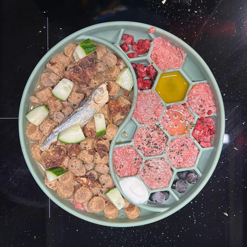 Vi bruker den til VOM, frukt og grønt, isbiter, egg og små tygg. Av og til fryser jeg den litt med VOM nedi for at det skal vare litt lenger. Veldig fornøyd.