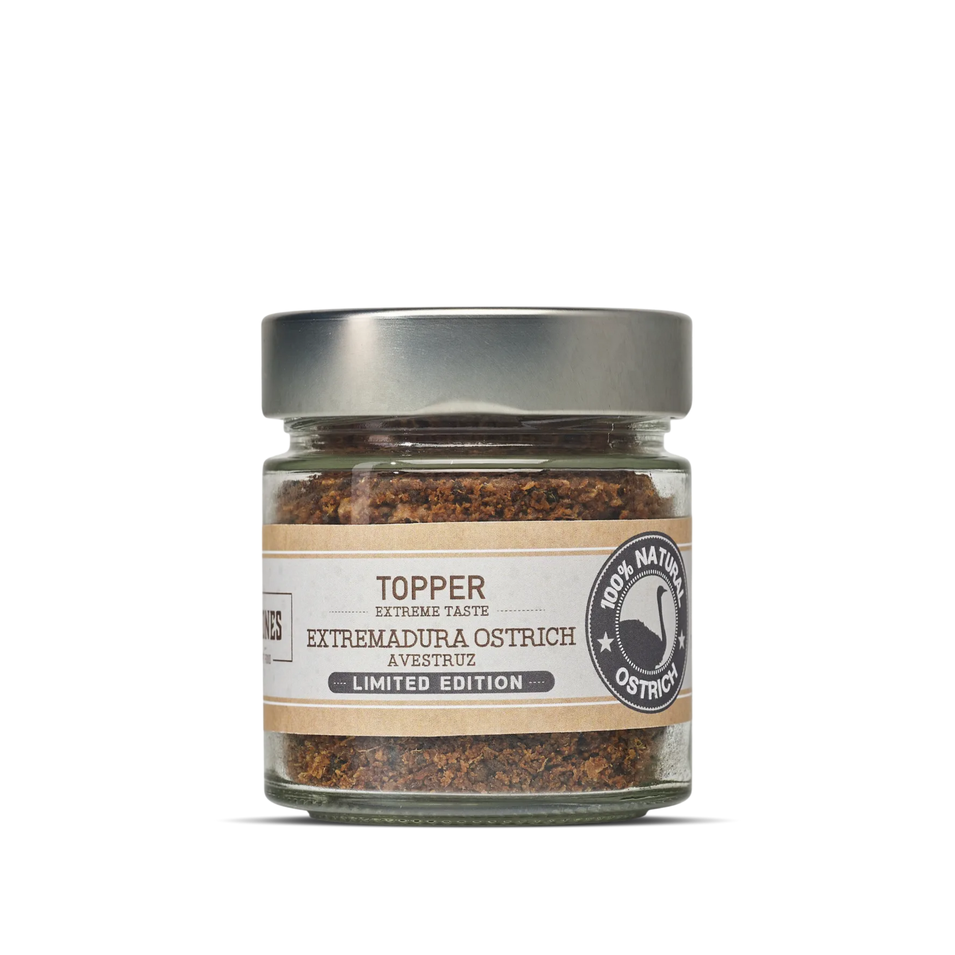 Denne topperen er produsert utelukkende av kjøtt av frittgående struts fra Extremadura. Den gjenspeiler Mr. Bones' forpliktelse til å bruke lokale råvarer. Regionens tørre, solrike klima oppmuntrer til ansvarlig og bærekraftig jordbruk. De samarbeider med en liten lokal produsent med årelang erfaring innen dyrevelferd og naturlig ernæring.