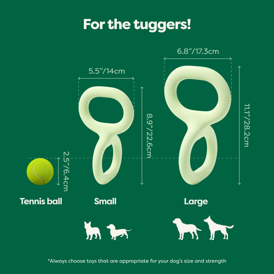 Tug Toy er ergonomisk designet for å beskytte håndleddet, noe den gjør ved å støtte det naturlige bevegelsesområdet og gir samtidig trygg avstand til hunden. Den har to håndtak, som oppmuntrer til interaktiv lek enten mellom deg og hunden eller to hunder. Den glatte, buede formen gjør det enkelt for både mennesker og hunder å plukke opp og den ribbede teksturen gir et godt grep.