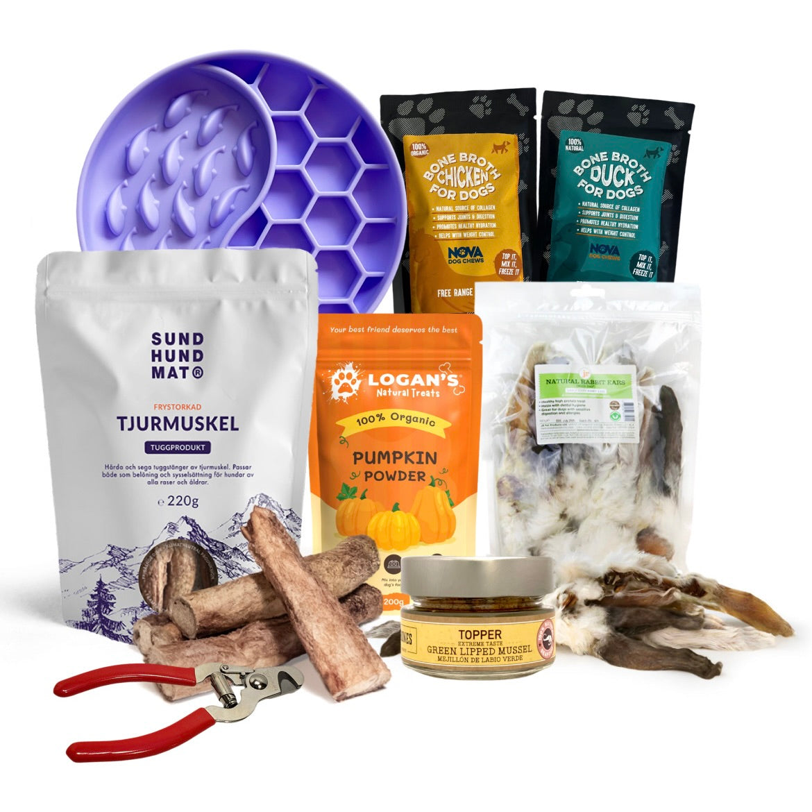 INNHOLD: 1 x slowfeeder HVALER i valgfri farge, 2 x beinkraft i valgfri smaker, 1 x pose kaninører med pels, 1 x pose med oksemuskel, 1 x pose gresskarpulver, 1 x klotang og ikke minst 1 x topperen av grønnleppemusling.