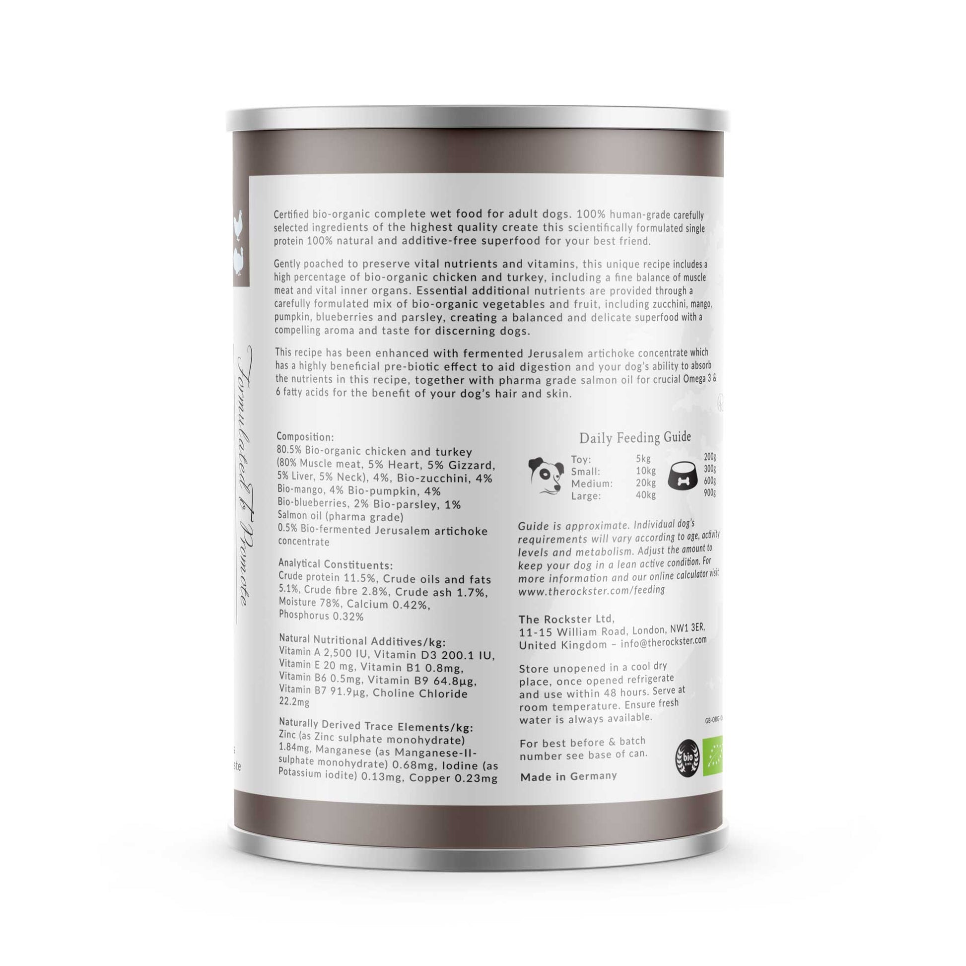 Ingredienser: 80,5% økologisk kylling og kalkun (80% muskelkjøtt, 5% hjerte, 5% krås, 5% lever, 5% nakke), 4% økologisk squash, 4% økologisk mango, 4% gresskar, 4% økologisk gresskar, 2% økologisk persille, 1% lakseolje (pharma grade), 0,5% økologisk fermentert jordskokk konsentrat.